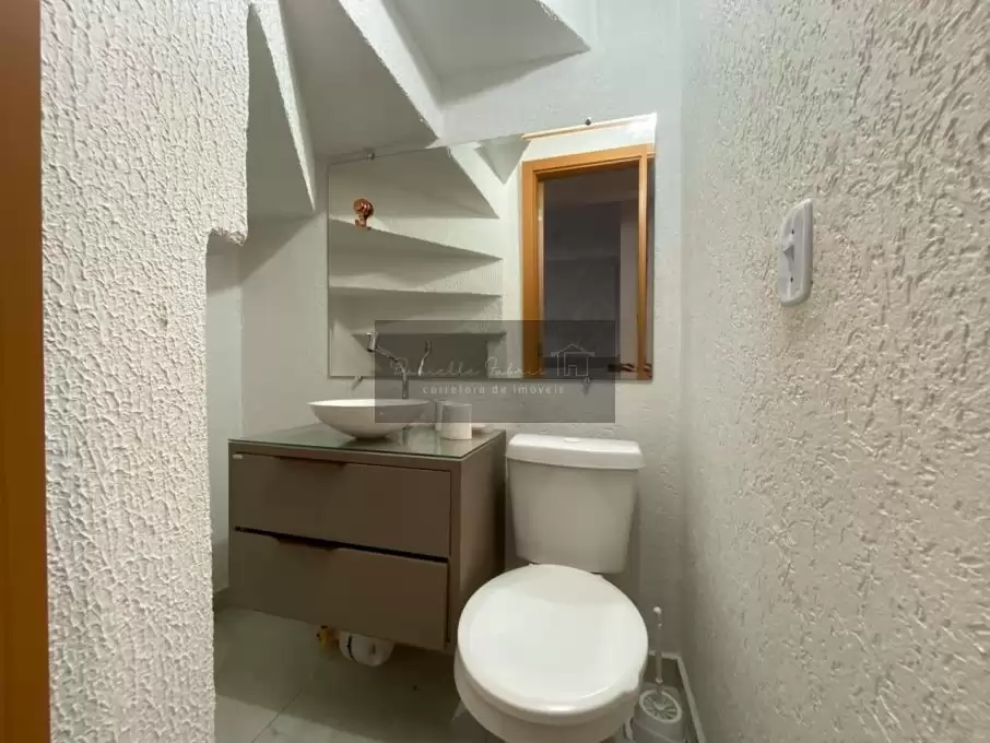No pavimento inferior, o imóvel conta com 2 vagas de garagem, sala de TV e sala de jantar com bancada em mármore, além de lavabo com cuba e espelho.